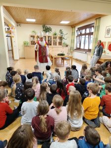 Heute hat uns in der Schule der Nikolaus besucht. Wir haben ihm Gedichte aufgesagt und Lieder vorgesungen. Als Geschenk brachte er uns einen Germkrampus mit und erzählte uns eine spannende Geschichte.